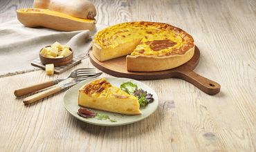 Pâte brisée pur beurre garnie d'un appareil cuisiné à partir de lait entier, d'œufs, de crème fraîche et d'épinards 19,9%, agrémenté de concassée d'oeufs durs, de dés de Beaufort AOP et d'une pointe de cumin et curry.